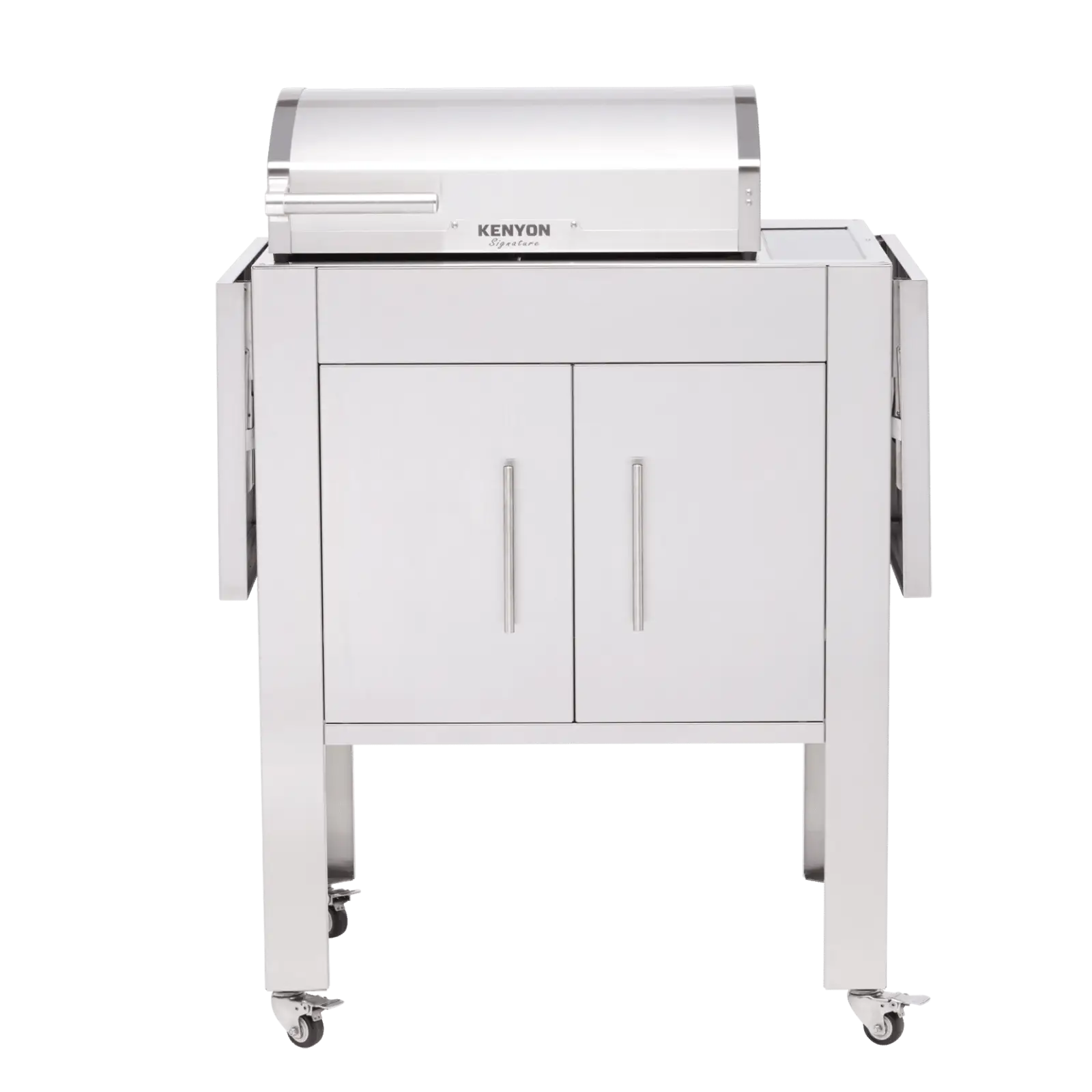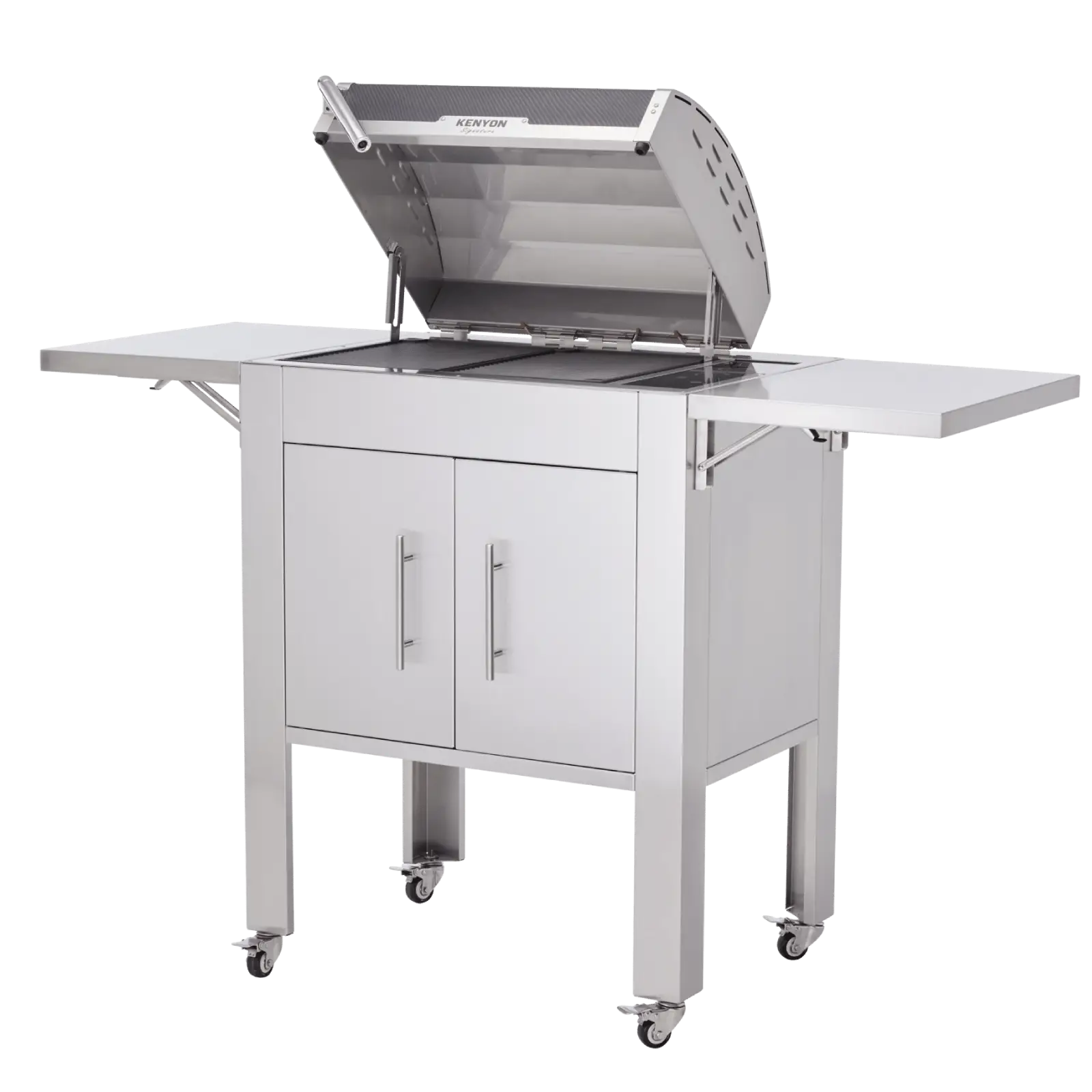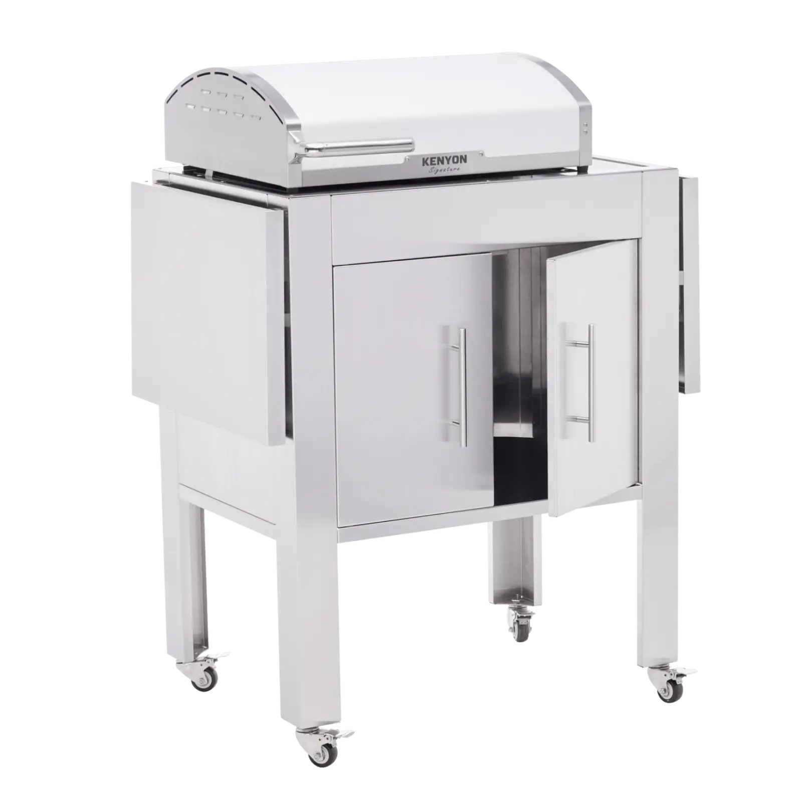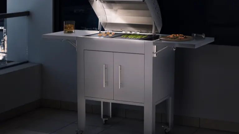 Los estantes plegables dobles ofrecen espacio extra de preparación mientras se cocina y ahorran espacio cuando no se usan. Los gabinetes brindan espacio de almacenamiento adicional.