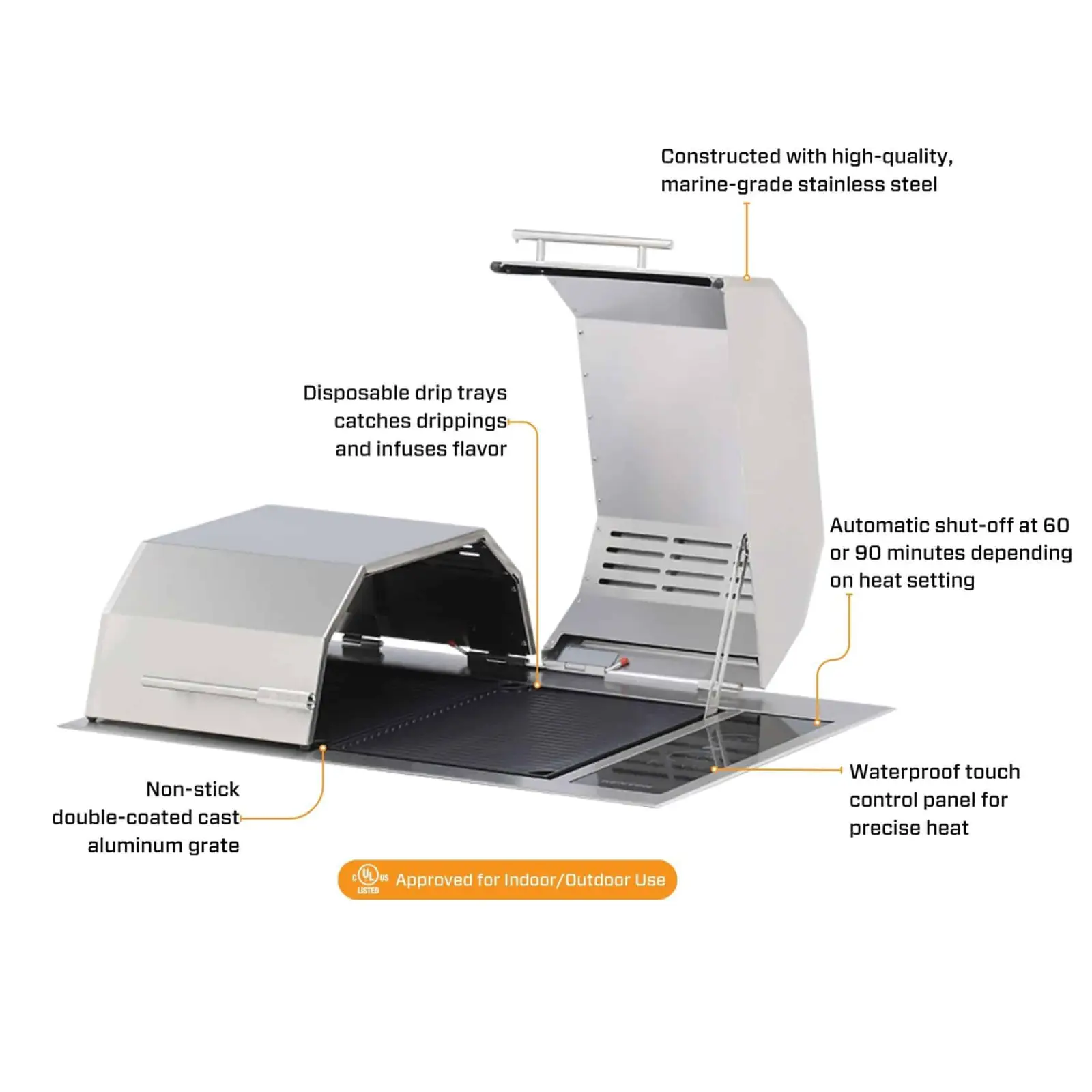 Aprobada por UL para uso en interiores y exteriores. Construida con acero inoxidable de grado marino y alta calidad. Diseñada y fabricada en EE. UU.